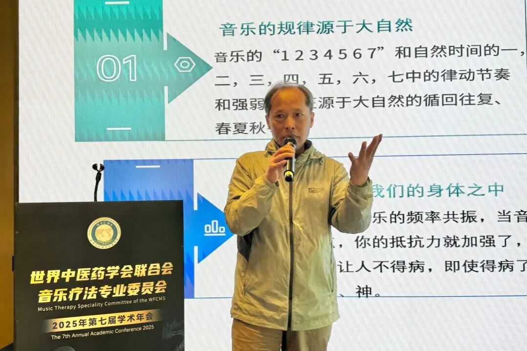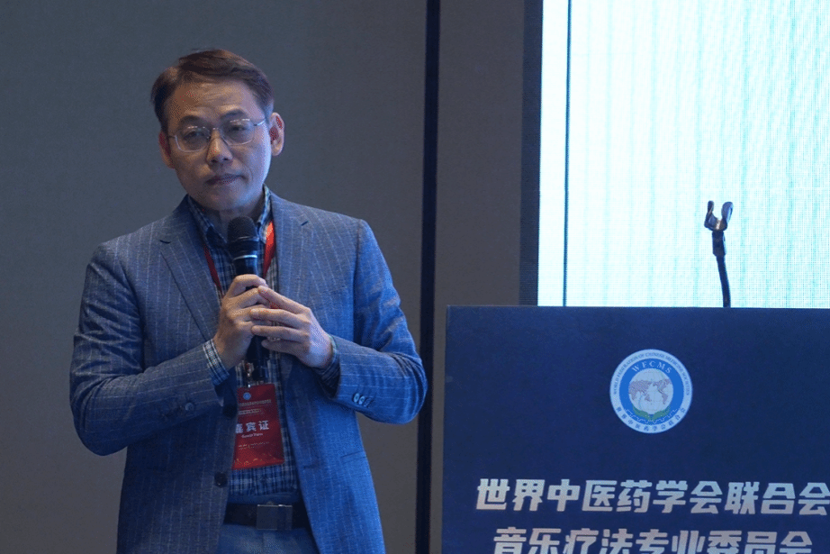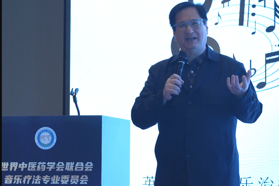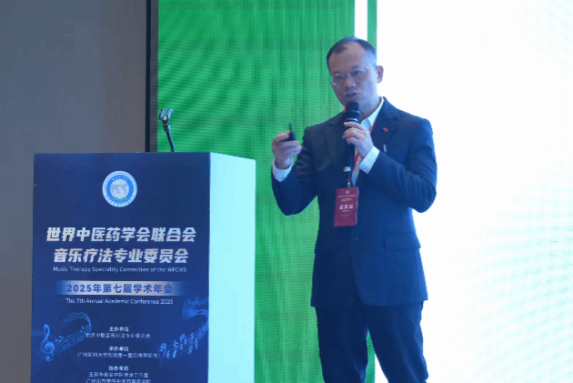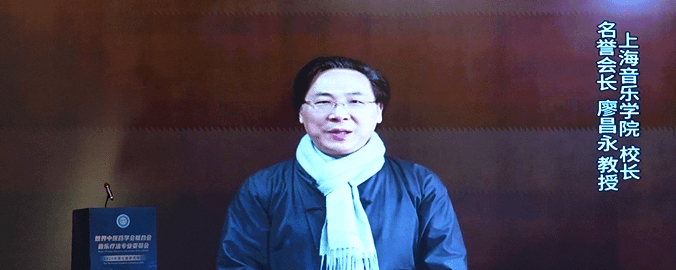 名誉会长、上海音乐学院院长廖昌永教授通过视频发表致辞。他在致辞中提到,本次年会以“音乐疗法与健康湾区”为主题,不仅呼应了“健康中国”战略的宏伟蓝图,更体现了中医药与音乐治疗融合创新的时代使命。他认为音乐不仅是艺术的表达,更是疗愈心灵、守护健康的重要力量。五音与五脏相对应的传统理论正在与现代声学、心理学研究相结合,开创出具有中国特色的心身整合干预新路径。湾区开放的创新生态、广阔的国际化平台、雄厚的医疗资源与多元的文化底蕴,为探索“中医药+音乐治疗”新模式创造了绝佳条件。他强调,粤港澳三地在标准制定、资格互认、服务衔接等方面的创新合作,将为大湾区乃至全国的音乐治疗事业发展注入新的动能。他希望大湾区成为中医药音乐疗法的创新试验田、成果转化地与国际交流窗。