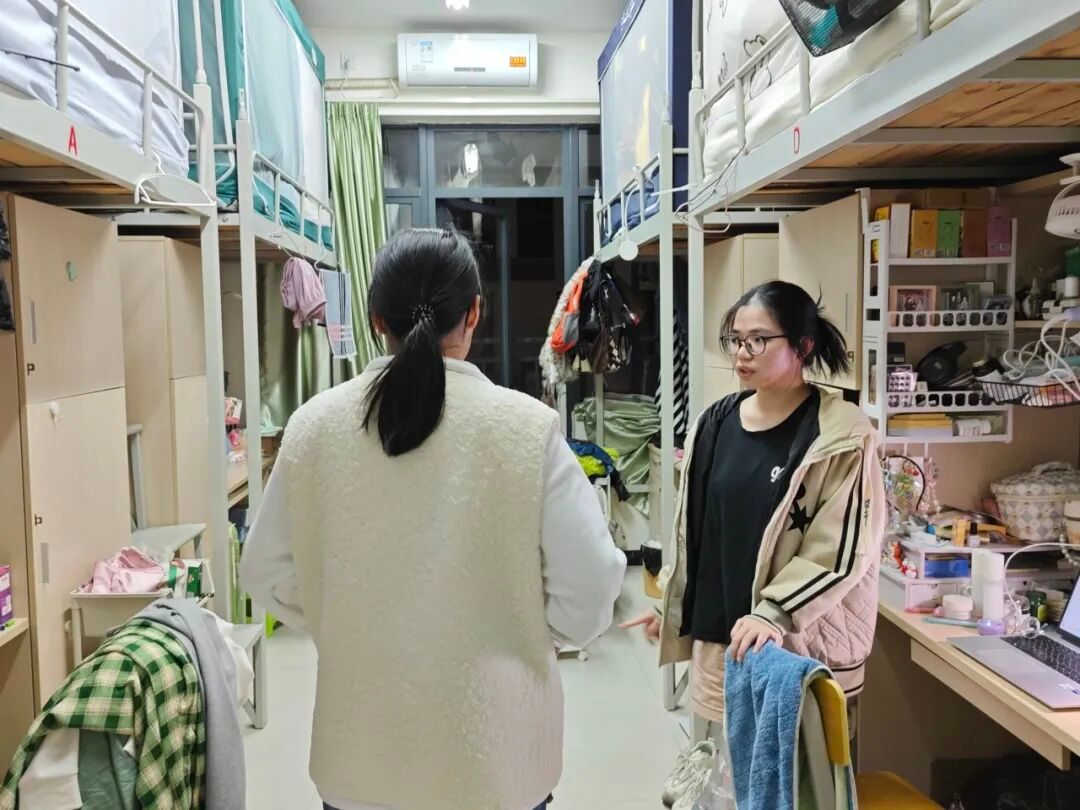 在关怀的同时,安全检查亦是本次走寝的重要一环。老师们对宿舍用电安全进行了重点排查,提醒大家严禁使用违规电器,不私拉乱接电线,做到人离电断。同时,也提醒同学们妥善保管个人贵重物品,离宿时锁好门窗,共同维护安全、整洁、和谐的宿舍环境。