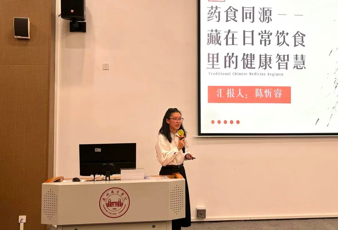 陈忻睿同学以“药食同源中的饮食智慧”为主题,分享了如何通过日常饮食调理五脏。她举例介绍了菊花、枸杞的滋补肝肾功效,莲子心的安神作用等常见食材的养生价值,并总结出“适量食用、合理搭配、不替代药物”三大原则,强调科学运用药食同源理念的重要性。