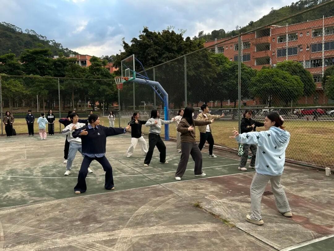 晨练时分,同学们陆续到达球场,自动整齐列队。随着《我的未来式》明快的音乐响起,大家跟随节拍迈步、挥臂,即便偶尔动作稍慢,也能迅速调整跟上。简单的跳跃与伸展,有效激活了沉睡的身体。随后进行的八段锦练习中,同学们身姿端正,跟随领练员的示范,抬手、转体、屈膝、按掌,动作舒缓而到位。现场气息均匀,心神凝聚,一招一式尽显舒展与松弛。八段锦作为流传最广的古代导引术,对脊柱保养、关节调节与身心协调均有积极促进作用。
