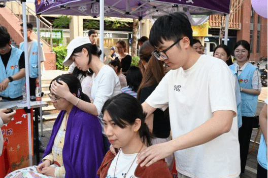 “同学,你的斜方肌有点紧,平时是不是经常低头看手机?”推拿体验区前排起了长队,教工第一、第二党支部的专业教师率先示范,中医适宜技术协会会长刘晓婷紧随上阵,师生配合为同学们缓解肌肉疲劳。下午16:40,推拿体验区的热度依旧不减,协会培训部的成员们接棒上阵,继续用专业的经络推拿技术为同学们赶走疲惫。