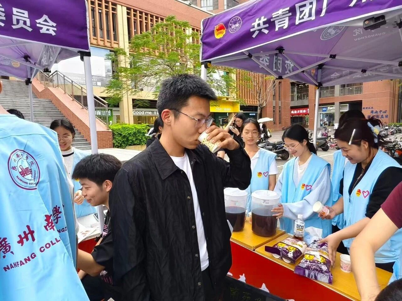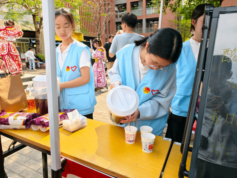 酸甜可口的酸梅汤与清香怡人的疏肝茶,不仅解渴生津,更传递着春日里的暖心关怀。不少同学喝完一杯又续一杯:“刚好今天有点热,酸梅汤太解暑了!”“疏肝茶喝完感觉人没那么困了!”一壶接一壶见底,同学们的热情比茶水更暖,师生间的欢声笑语也在茶饮区不断回荡。