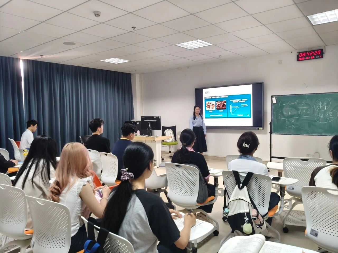 “温老师的课能用生活案例、简单类比拆解复杂概念,把难懂的热力学、动力学知识讲得清晰易懂。”24级中药制药郑雅骞同学在回忆《物理化学》课堂时说。在温老师的课堂上,最令人印象深刻的,是她化抽象为具体的教学方式。她善于运用生活案例拆解复杂公式,使热力学、动力学等内容变得通俗易懂。与此同时,温老师注重互动引导,通过提问激发学生思维,并对每一个疑问给予耐心解答,营造出轻松而积极的课堂氛围。